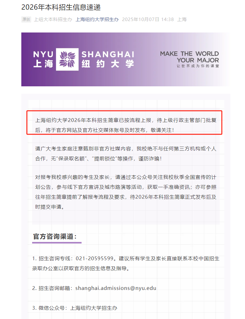 上海纽约大学2026年综合评价简章尚未公布,官方最新回应显示 “已上报待上级批复”,发布时间暂未明确。