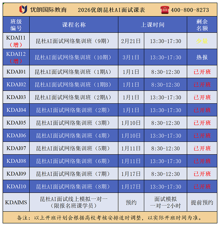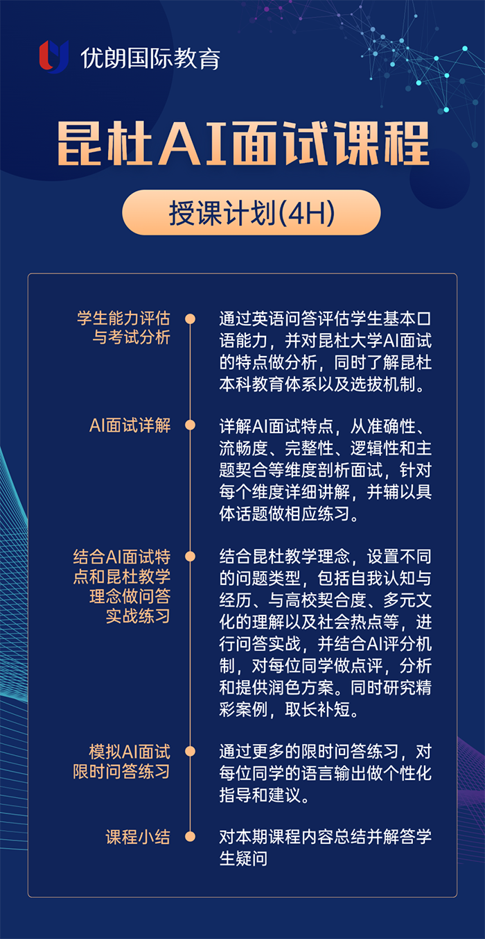 鉴于高三阶段考生学业繁忙,为助力考生高效应对此次AI面试,优朗教研团队全新研发出专门针对昆山杜克大学AI面试的课程体系,现将授课内容与课表呈现如下: