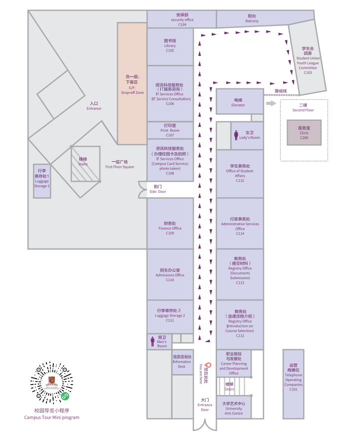 Entrance and exit routes for vehicles are shown as below. New students and parents can enter the campus from the South Gate on Longxiang Boulevard (near Dao Yuan Building) and East Gate on Longfei Boulevard (near Administration Building). Private cars can only enter through East Gate.