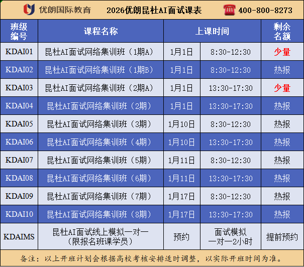 鉴于高三阶段考生学业繁忙,为助力考生高效应对此次AI面试,优朗教研团队全新研发出专门针对昆山杜克大学AI面试的课程体系,现将授课内容与课表呈现如下: