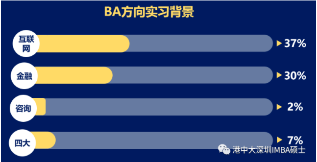 BA新生中,37%曾在互联网科技公司实习,30%曾在金融行业(如投行、券商、基金、银行)实习,2%曾在咨询实习,7%曾在会计事务所实习。